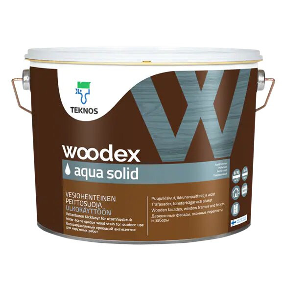 Nato površino, obdelano z osnovnim premazom oz impregnacijo, premažite z WOODEX AQUA SOLID, razredčeno približno 10% volumsko. Pustite, da se suši 12h. Nanesite s čopičem. Pri barvanju z brizganjem mokro pobarvano površino zaključite s čopičem. Da bi dosegli najbolj dolgotrajno obdelavo, lahko NORDICA PRIMER uporabimo za temeljni premaz. Čas sušenja je 1–3 dni, odvisno od temperature in vlažnosti zraka. Še posebej previdno ravnajte s končnimi deli lesa in jih primerno zaščitite.